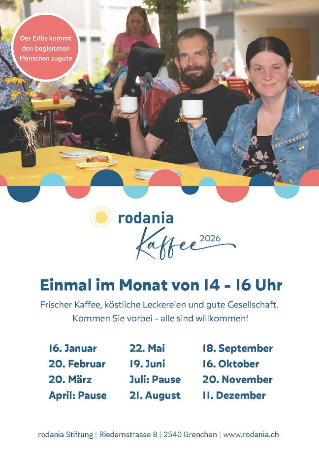 Einmal im Monat, von 14 - 16 Uhr, öffnen wir unsere Türen zum rodania Kaffee. Geniessen Sie frischen Kaffee, köstliche Leckereien und gute Gesellschaft - alle sind willkommen! Und das Beste: Der Erlös geht zu Gunsten der von uns begleiteten Menschen.